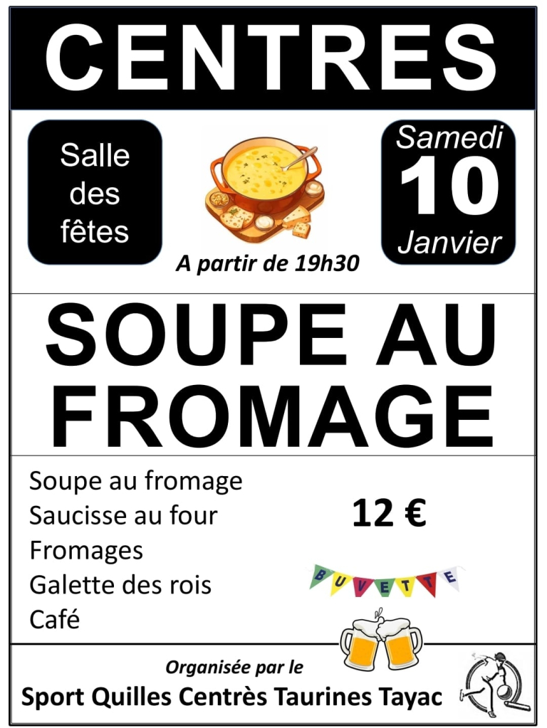 Les membres du Sport quilles Taurines-Tayac ont le plaisir de vous inviter au repas « soupe au fromage » qui aura lieu le samedi 7 janvier à 19h30 à la salle des fêtes de Centrès. Venez nombreux pour les soutenir !!!