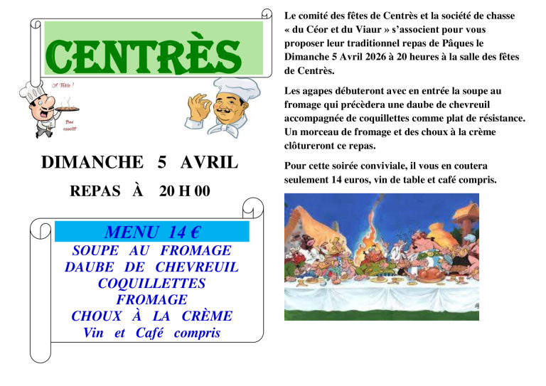 Le comité des fêtes de Centrès a le plaisir de vous accueillir le 29 octobre à une soirée repas: Soupe au fromage à 20h00 à la salle des fêtes du village. Le repas est concocté par les bénévoles de l’association