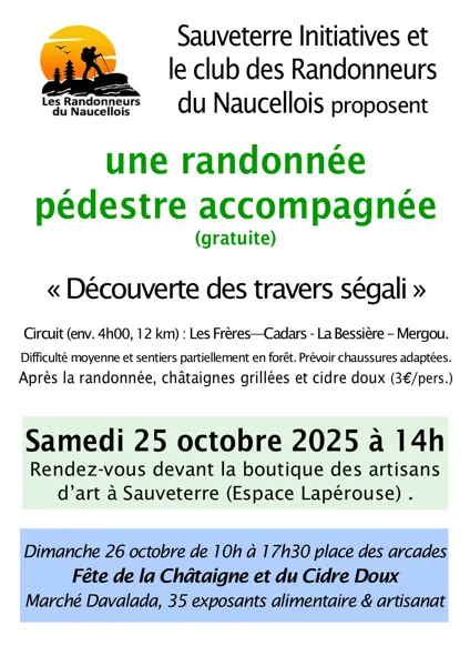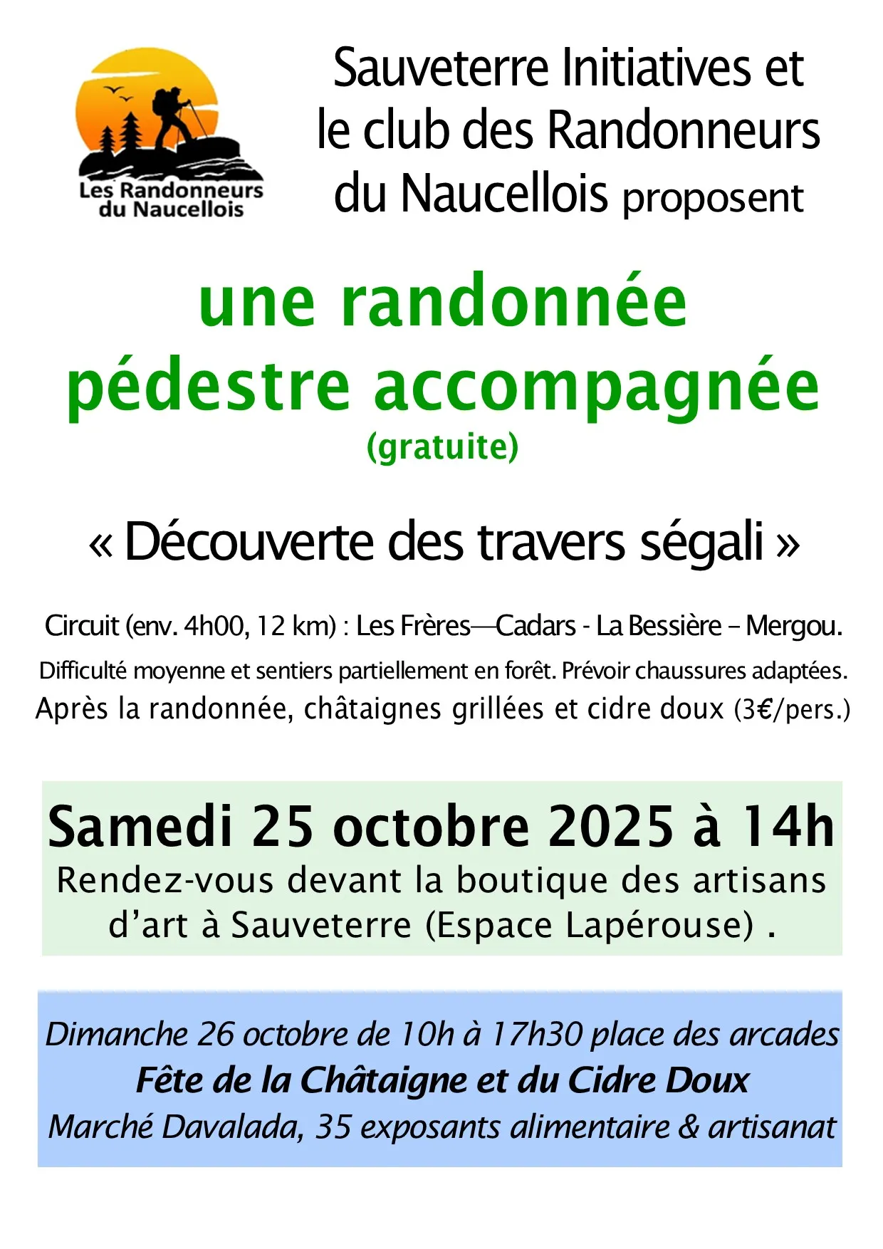 En cette veille de la célèbre « Fête de la châtaigne », partez avec les Randonneurs du Naucellois et Sauveterre Initiative à la découverte des sentiers qui enlacent la bastide à l’occasion d’une randonnée suivie d’une grillée de châtaignes.